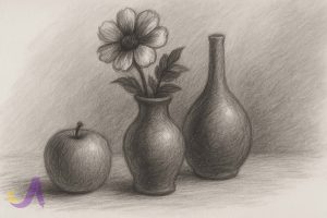 • طراحی طبیعت بی‌جان ساده: مثلاً یک میوه (مانند سیب یا گلابی) یا یک فنجان را طراحی کنید. این اشیا ساده اما دارای انعکاس نور و سایه هستند که خوب است تمرین شوند.