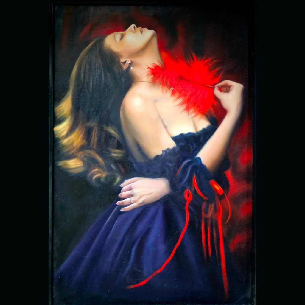 تصویر نقاشی شده زنی که سر خود را به عقب برده با موهای باز با رنگ روغن